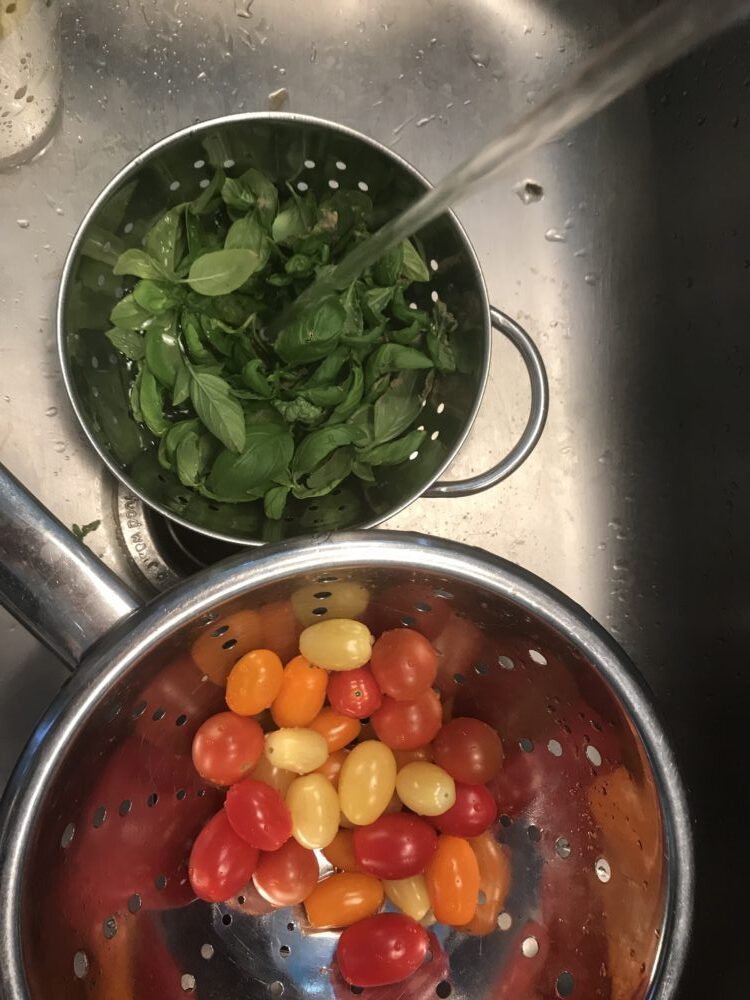 - Bring a large pot of water to boil. While the water is boiling, chop up the tomatoes – I just cut the little ones in half. Add the pasta to the water and cook according to package directions.